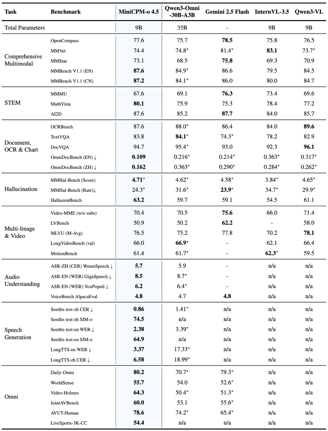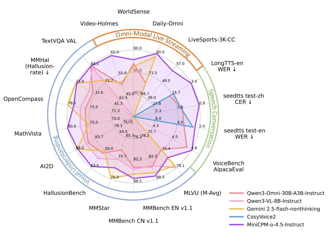 - 卓越的 OCR 与多语言能力: MiniCPM-o 4.5 支持高分辨率图像(可达 180 万像素)和高帧率视频(最高 10FPS)的高效处理。在文档解析任务上表现出色——在 OmniDocBench 基准上达到当前最优水平,超越了包括 Gemini-3 Flash、GPT-5 在内的先进专有模型,以及专业的OCR 工具 DeepSeek-OCR 2。此外,在多模态安全和真实性测试(如 MMHal-Bench)中表现可靠,与 Gemini 2.5 Flash 相当;还支持超过 30 种语言的多语言理解与生成能力,能应对跨语言的多模态应用场景。