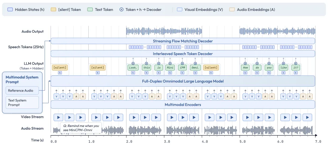 - 全新的全双工(Full-Duplex)流式交互: 相较以往“对讲机”式的单工交互,MiniCPM-o 4.5 原生支持全双工多模态实时流功能。这意味着模型可以在生成输出的同时,持续接收实时的视频和音频输入,不再局限于“一问一答”的回合制交互。它能够做到“边看、边听、主动说”:例如一边口述回答用户的问题,一边不间断“观看”摄像头视频画面和“倾听”环境声音,从而不遗漏任何关键信息。得益于全双工和主动交互机制,模型可以自主监控输入流并智能决策何时发言,以最恰当的时机做出提醒或评论,实现更加流畅自然的人机对话体验。