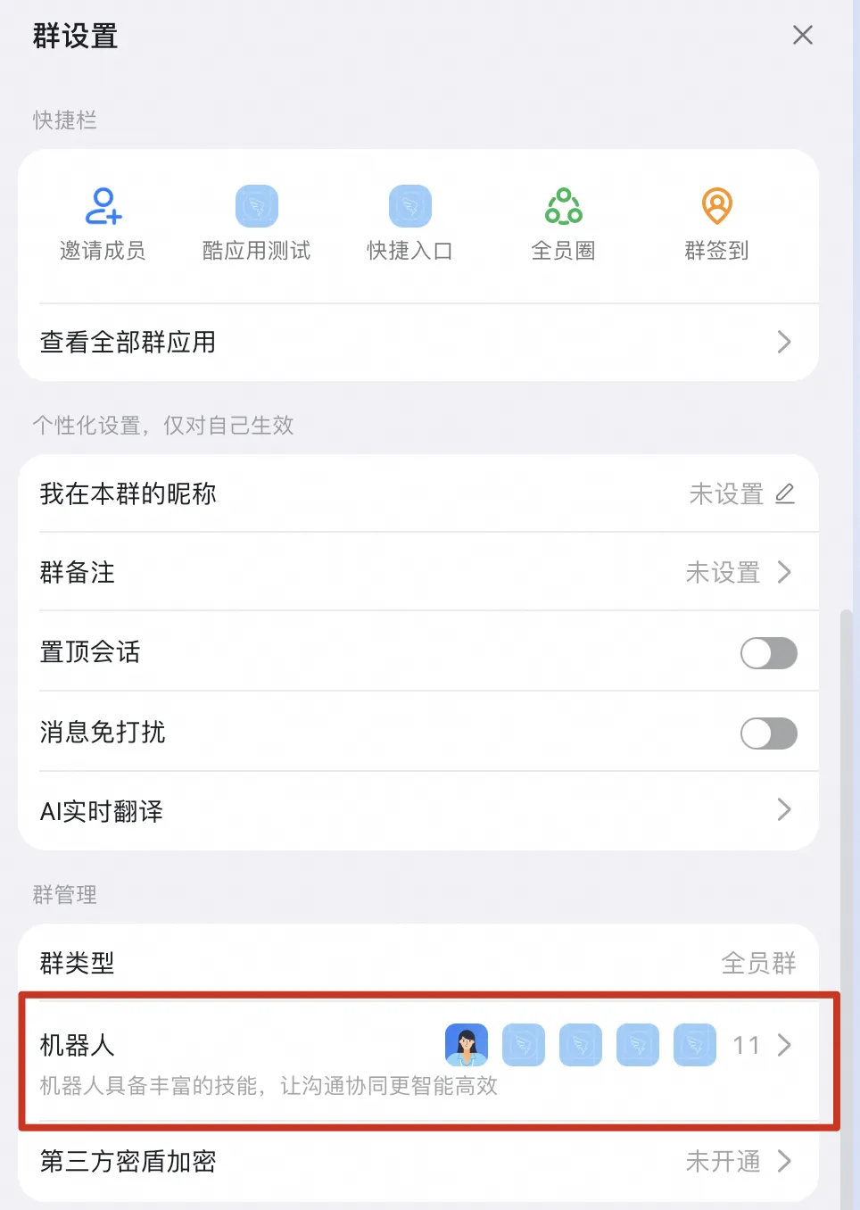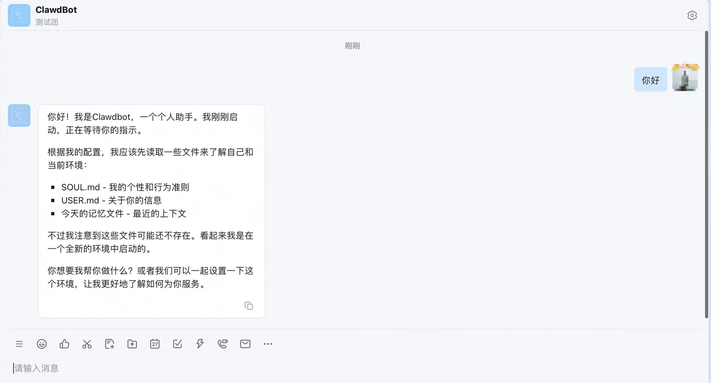 3. 测试机器人 你可以创建群聊或在已有群聊中添加机器人,并与机器人对话,查看效果。