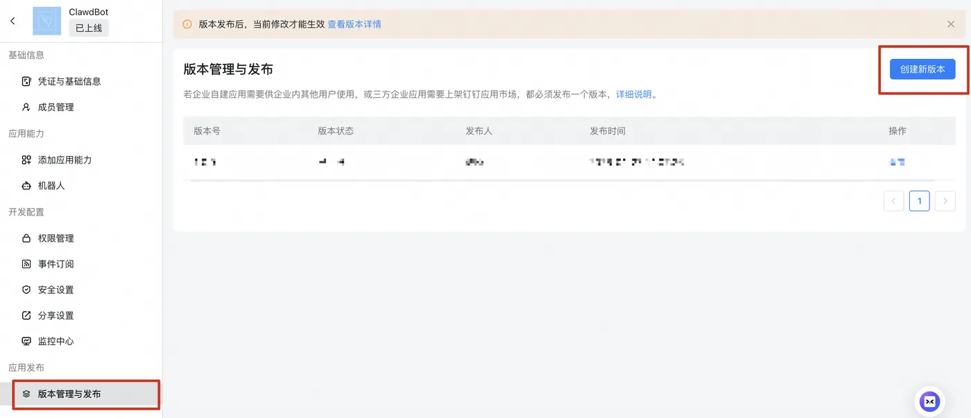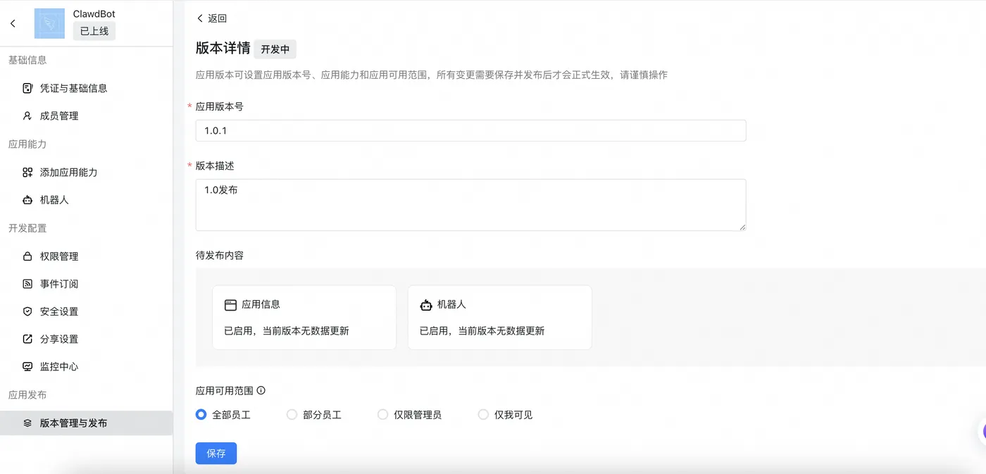 2. 在目标应用开发导航栏,点击版本管理与发布,在版本管理与发布页面,点击创建新版本。进入版本详情页面,输入应用版本号和版本描述信息,选择合适的应用可见范围,完成后点击保存。并在弹窗中点击直接发布。