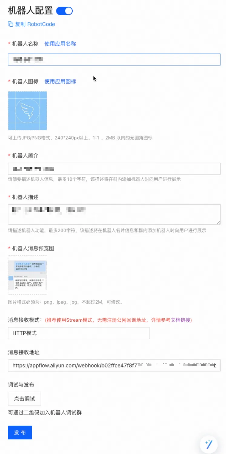 - 消息接收模式请选择HTTP模式,消息接收地址为刚刚的 WebhookUrl。然后点击发布。