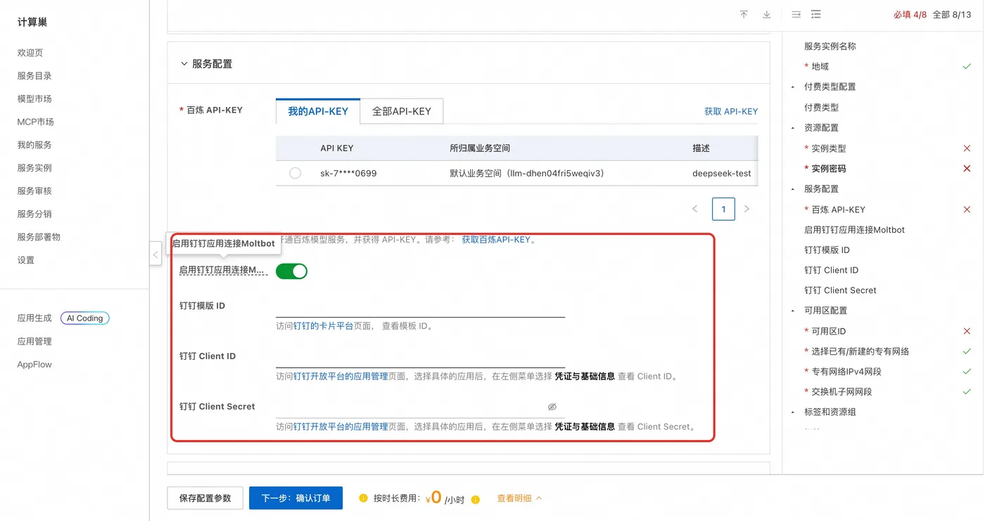 - 在服务部署页面,启用钉钉应用连接Moltbot,填写上述获取的钉钉消息卡片模版ID、ClientID和Client Secret