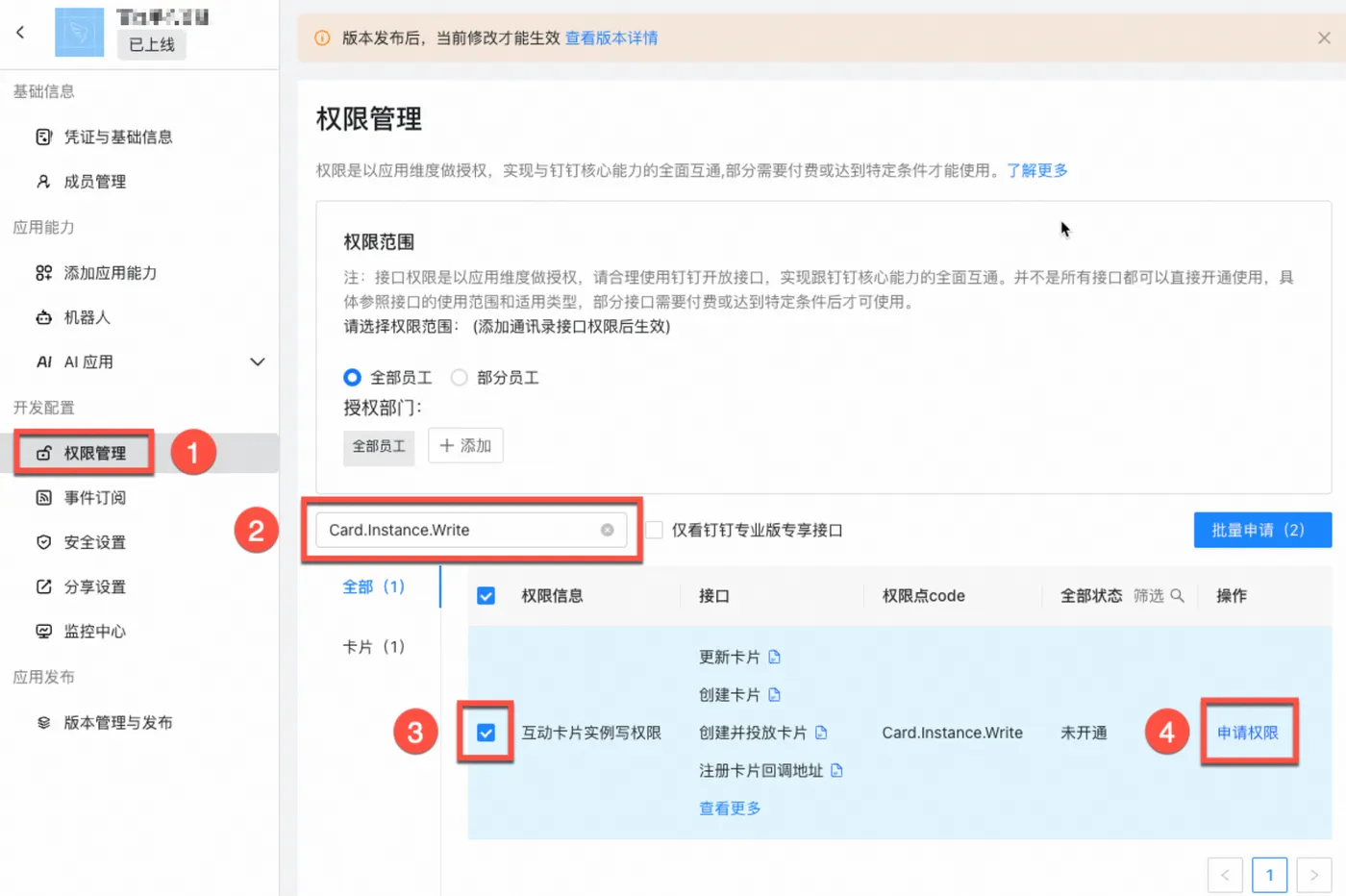 - 在左侧菜单选择开发配置 > 权限管理,在左侧搜索框分别输入Card.Streaming.Write 和Card.Instance.Write,并在操作列点击申请权限。