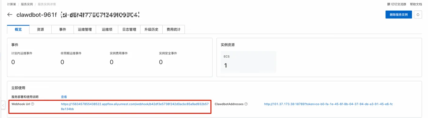 2. 等待部署完成后进入服务实例详情页。在页面上可以获取到**Webhook Url**,复制并保存