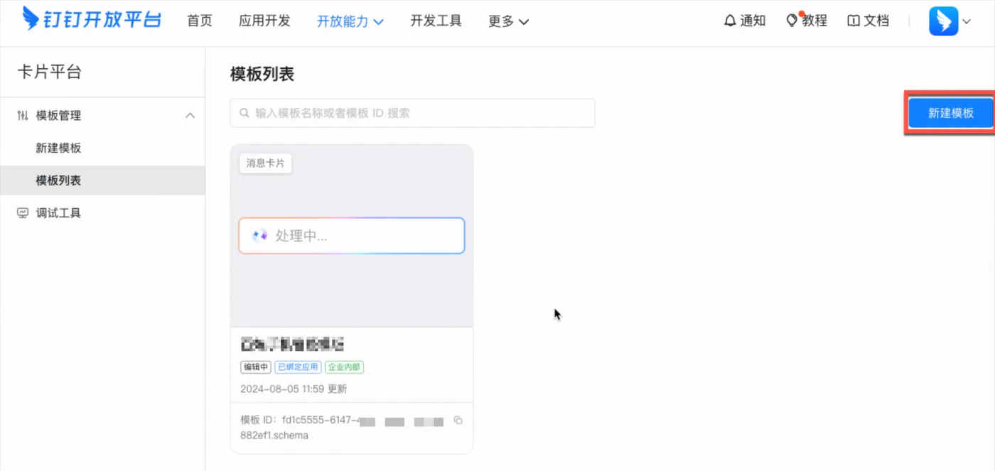 2. 在创建模板输入框,填入模板信息,单击创建。 * 卡片类型:消息卡片 * 卡片模板场景:AI 卡片 * 关联应用:您在之前步骤创建的钉钉应用 3. 在模拟编辑页面,不要使用预设模板,不需要进行任何额外操作,直接保存并发布模板。然后点击返回模板列表页面。