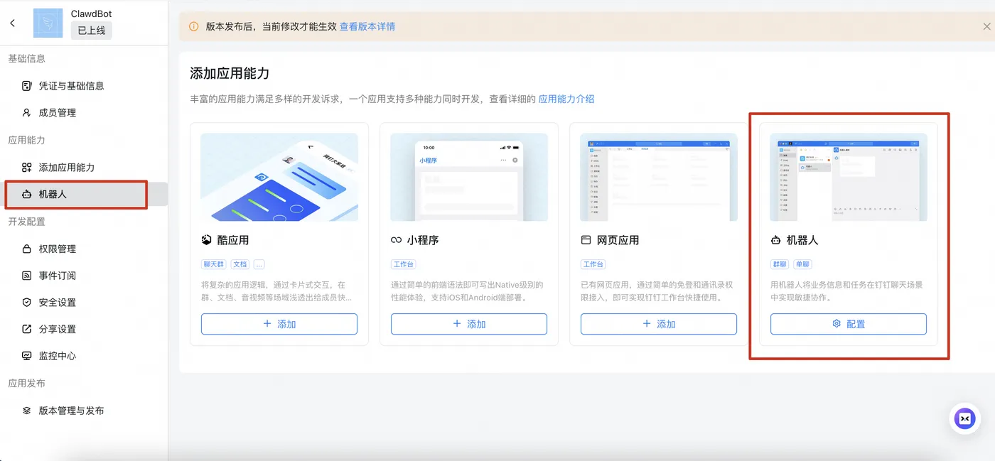 - 访问钉钉应用列表。找到刚刚创建的应用,点击应用名称进入详情页面。 在添加应用能力页面,找到机器人卡片,点击添加。