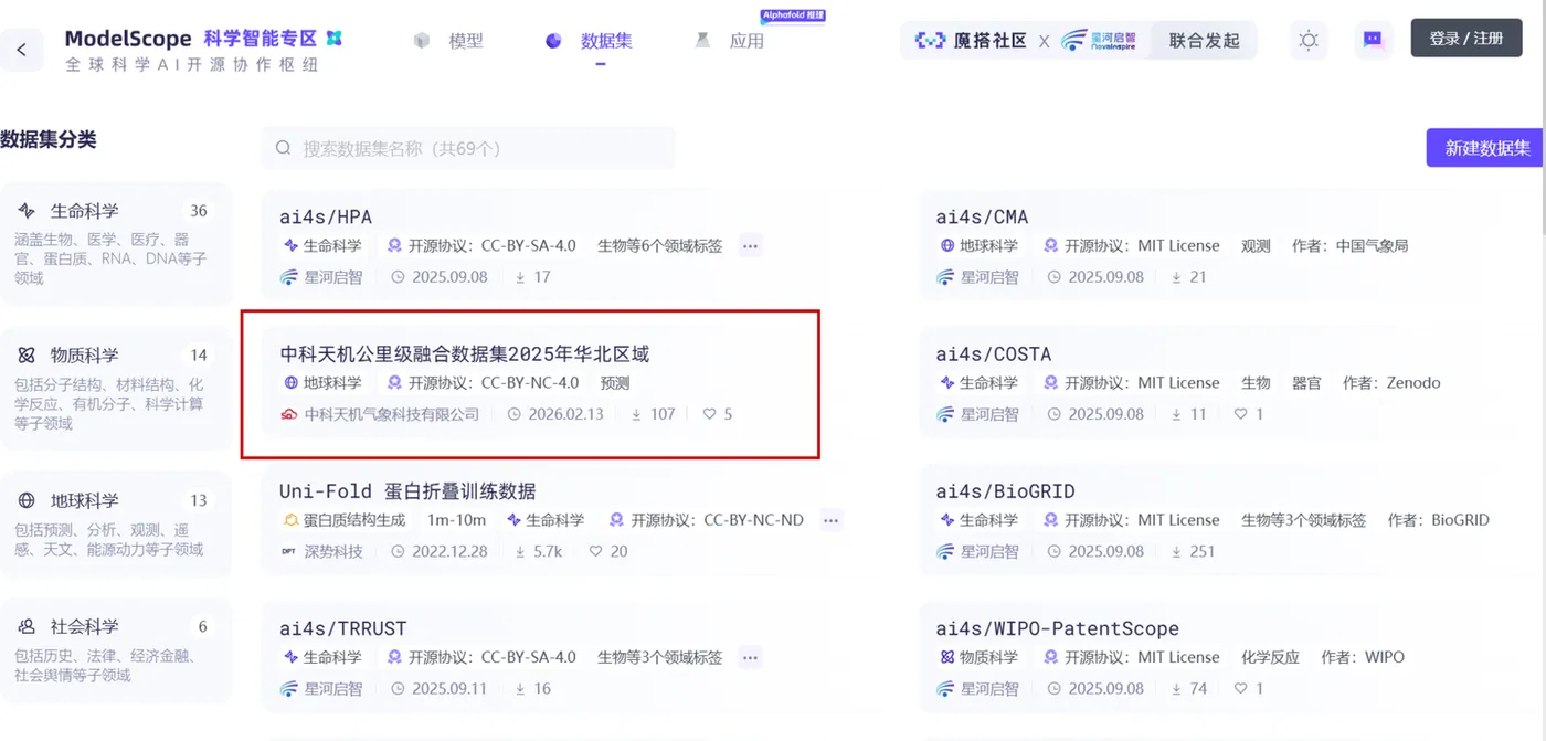 魔搭社区自2022年11月成立以来,已成长为中国最大AI开源社区,服务全球超2000万用户。2025年9月,魔搭社区在云栖大会上正式发布科学智能专区,致力于连接全球科学家,用AI驱动生命科学、地球科学、社会科学等领域的科研范式创新。中科天机高质量气象数据集的引入,将显著增强魔搭社区在地球科学领域的数据能力与行业纵深。对于魔搭社区而言,天机数据弥补了其在气象垂直领域的高精度数据缺口,为气象AI模型的训练、验证与应用落地提供坚实的“数据底座”。对于中科天机而言,借助魔搭社区的开发者生态,高精度气象数据得以触达高校实验室、科研机构、AI初创公司,真正成为AI for Science的基础设施。