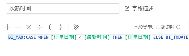 BI_MAX(CASE WHEN [订单日期] < [最新时间] THEN [订单日期] ELSE BI_TODATE('1888-09-09', 'yyyy-MM-dd') END)