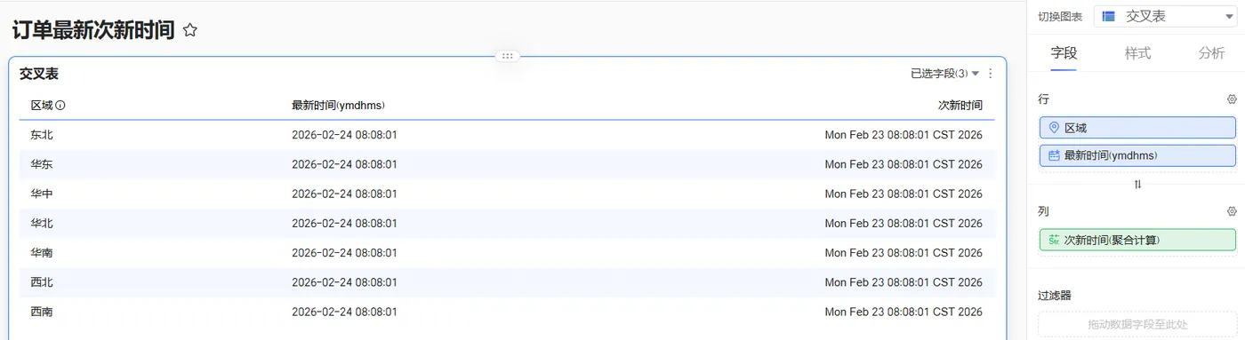 [区域]:维度字段,用于分组。[订单日期]:日期字段,用于计算时间。