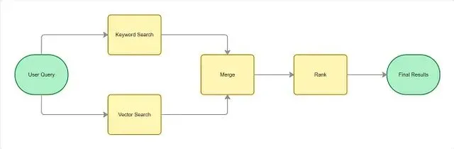 用户查询进来后,关键词搜索和向量搜索并行执行。关键词搜索产出一个词法相关性分数(比如 BM25),向量搜索产出一个语义相似度分数(比如余弦相似度),两路分数再融合成一个统一的排名分数。