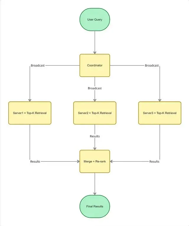 一台服务器扫 1 亿个向量太慢,那就拆成 10 台,每台扫 1000 万,并行跑。工作量分摊了,搜索同步进行,结果最终在协调器节点汇合。这是分布式搜索引擎和现代向量数据库的标准架构。