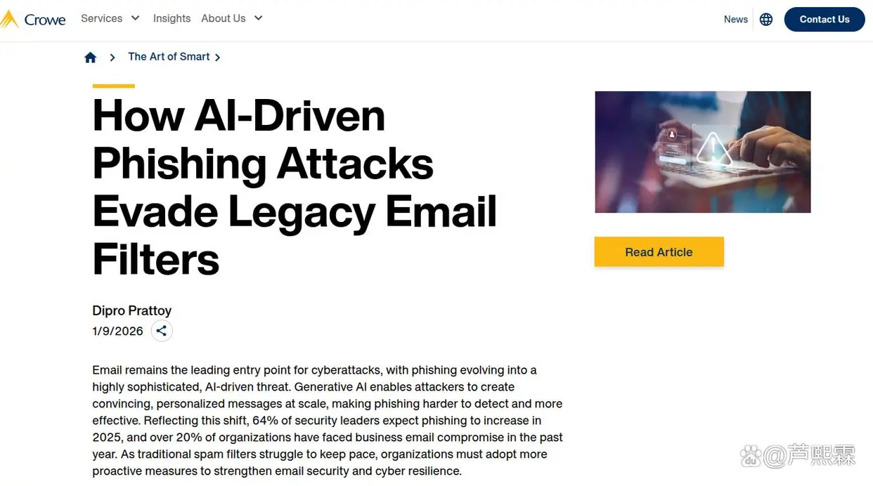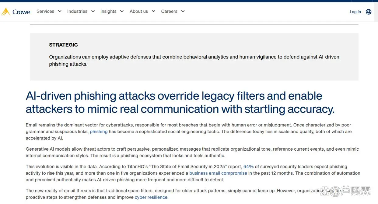 Crowe等安全机构近期的洞察报告揭示了一个严峻的现实:攻击者正在系统性地利用大语言模型(LLM)重塑网络钓鱼攻击的全生命周期。GenAI不仅能够以极低的成本批量生成语法无懈可击、语调自然流畅的邮件内容,彻底消除了传统检测赖以生存的“语言瑕疵”特征,更能够根据公开来源情报(OSINT),实时分析目标对象的社交媒体画像、职业背景及近期活动,生成极具针对性的鱼叉式钓鱼(Spear Phishing)邮件。这种高度个性化的攻击使得受害者在心理层面难以产生怀疑,从而大幅提升了点击率与转化率。