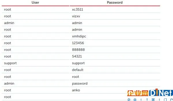 根据统计,锁定telnet传输埠的物联网恶意软件最常使用的凭证包括root(使用者名称)与xc3511(密码)、root与vizxv、admin与admin、root与admin、root与xmhdipc、root与123456、root与888888、root与54321等,基于SSH的物联网恶意软件所内建的入侵凭证则有admin与default、admin与admin、support与support、admin与1111、admin与空白(不用密码)、user与user、Administrator与admin、admin与root等。