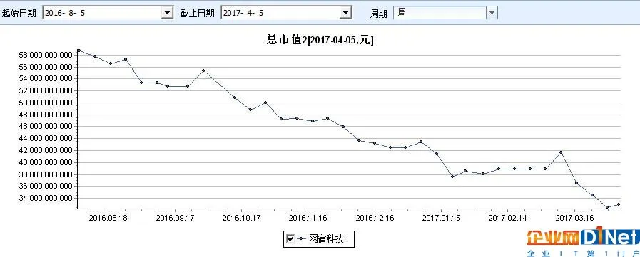 2017年3月30日,也就是阿里云再次宣布大幅降价后,网宿股价创下年内新低,收盘报价40.23元。公司市值也从去年7月的580亿左右,跌到320多亿。