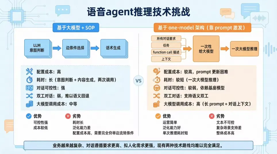 我们在建设语音对话的过程中,agent推理分别经历了SOP方式的推理和one-model方式的推理,我们期望能结合两者的优势:强指令遵循和内容可控性,低成本,支持语义双工等,建设一套适合语音对话场景下的推理引擎。