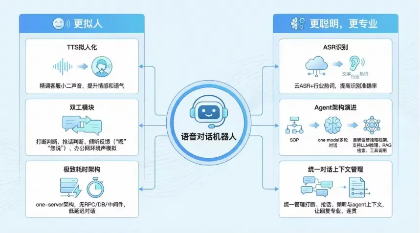 - 对话架构上:升级到one-server架构,一通对话,所有逻辑在一台服务上处理,在工程链路上的处理耗时减小到极致。
