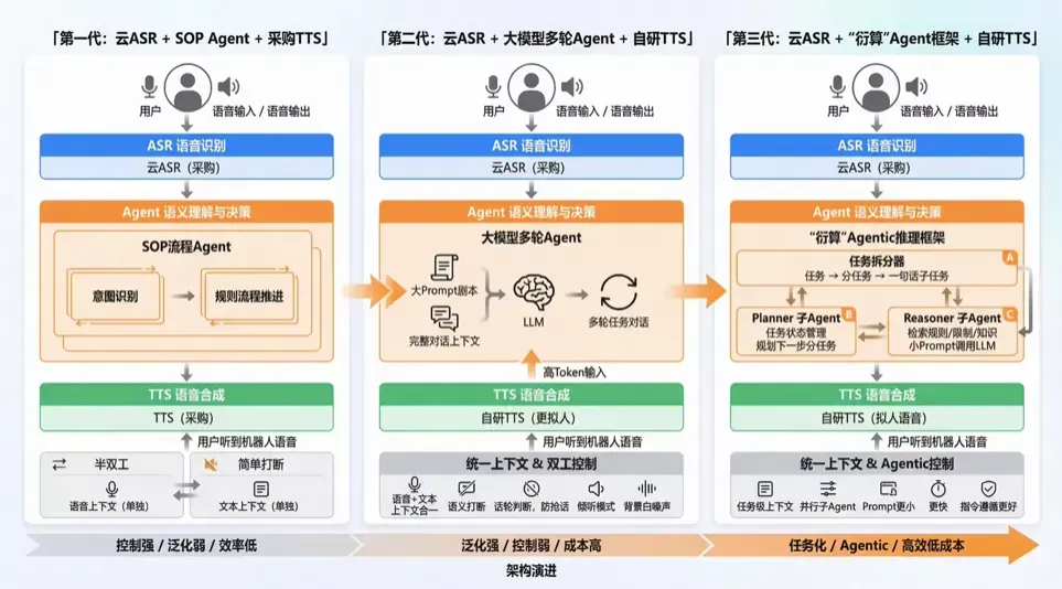在第一代的基础上,面对在实际业务中遇到的问题,我们在agent推理架构,tts,上下文工程和双工对话工程上做了大量的优化和改进。