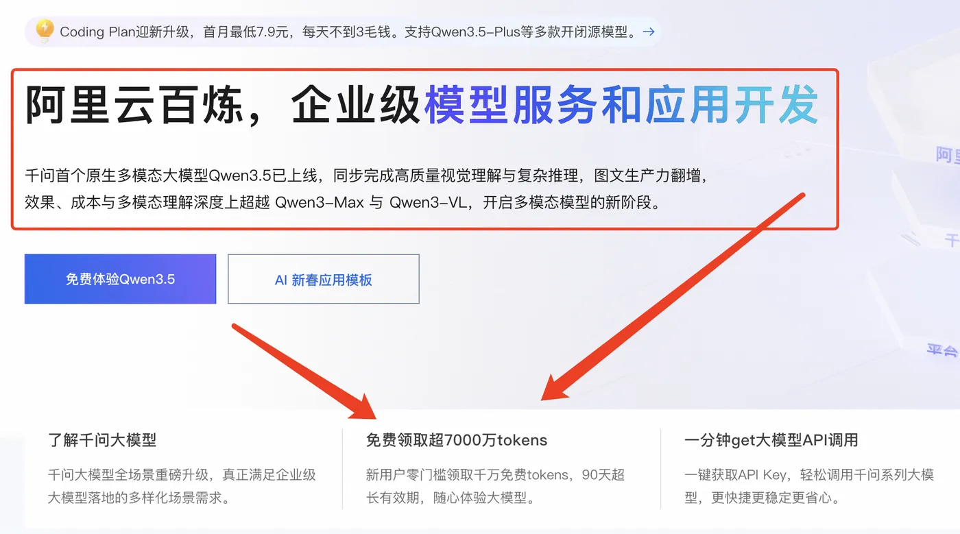 阿里云百炼提供北京、新加坡和弗吉尼亚地域的模型服务,各地域的API Key不同,选择邻近地域调用可降低网络延迟,详情请参见选择地域和部署模式。新用户开通百炼 90 天内,即可享受模型各 100万 Token 模型。