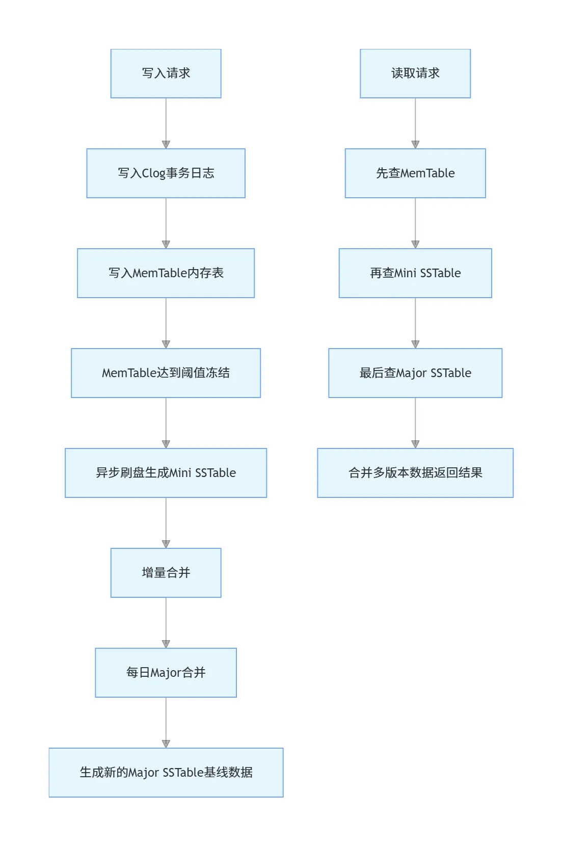 - Major SSTable:磁盘中的基线数据文件,通过合并操作将多个Mini SSTable与旧的Major SSTable合并,生成新的Major SSTable,清理无效数据,优化查询性能。
