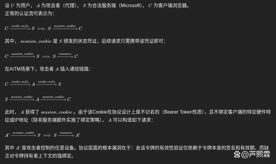AiTM攻击的核心在于将攻击者置于用户与合法身份提供商(IdP)之间,建立一个透明的双向代理通道。当用户输入凭据并完成二次验证时,攻击者能够实时截获服务器下发的会话令牌(Session Cookie),进而利用该令牌在另一台设备上重建合法会话。由于会话令牌通常具有较长的有效期且不再需要二次验证,攻击者从而实现了对账户的持久化控制。