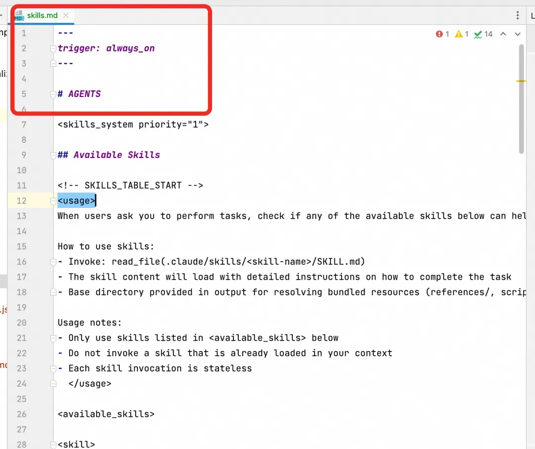 熟悉AI编程的大伙应该不陌生,上面生成的文件,就是Rule,只不过在不同的AI编程工具里有不同的叫法,比如Claude Code中叫claude.md,Codex 中叫AGENTS.md,灵码中其实就对应 project_rules.md。在Rule中,详细的定义了每个Skill的功能描述以及调用时机。我们要做的就是把AGENTS.md文件中的提示词,粘贴到project_rules.md就然后做些改造可以了,如下图所示,然后配置成一直生效的project_rules即可。