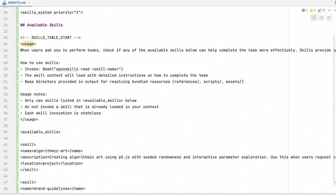 同步后会在当前项目根目录 agent.md下生成相关skill指令。