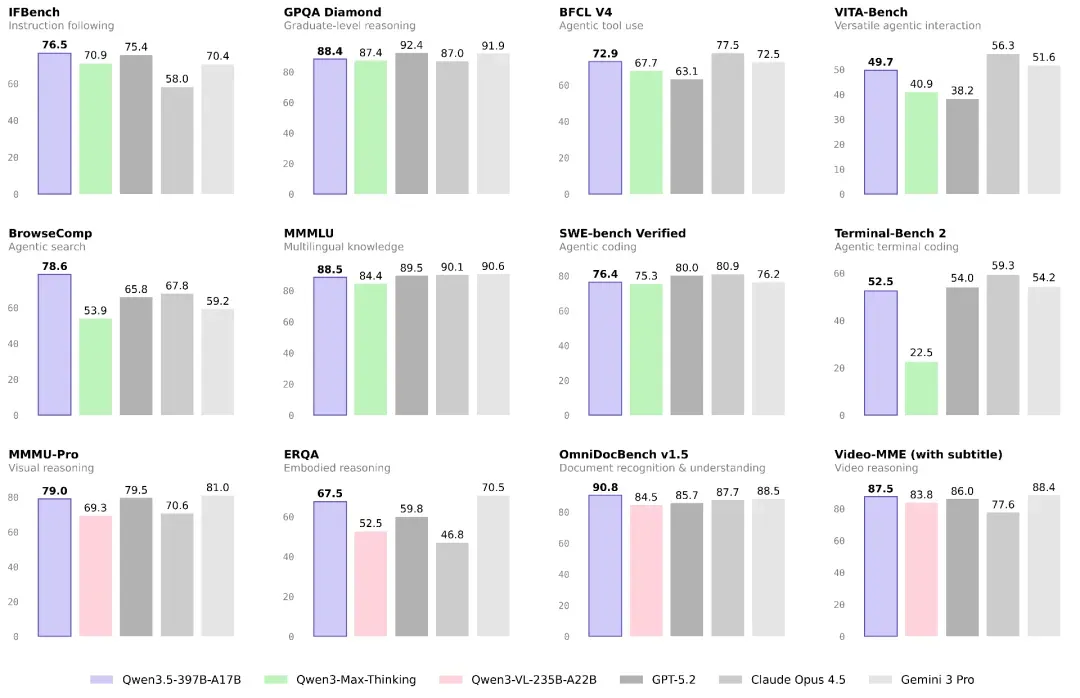 比如,千问3.5在MMLU-Pro认知能力评测中得分87.8分,超越GPT-5.2;在博士级难题GPQA测评中斩获88.4分,高于Claude 4.5;在指令遵循IFBench以76.5分刷新所有模型纪录;而在通用Agent评测BFCL-V4、搜索Agent评测Browsecomp等基准中,千问3.5表现均超越Gemini 3 Pro。