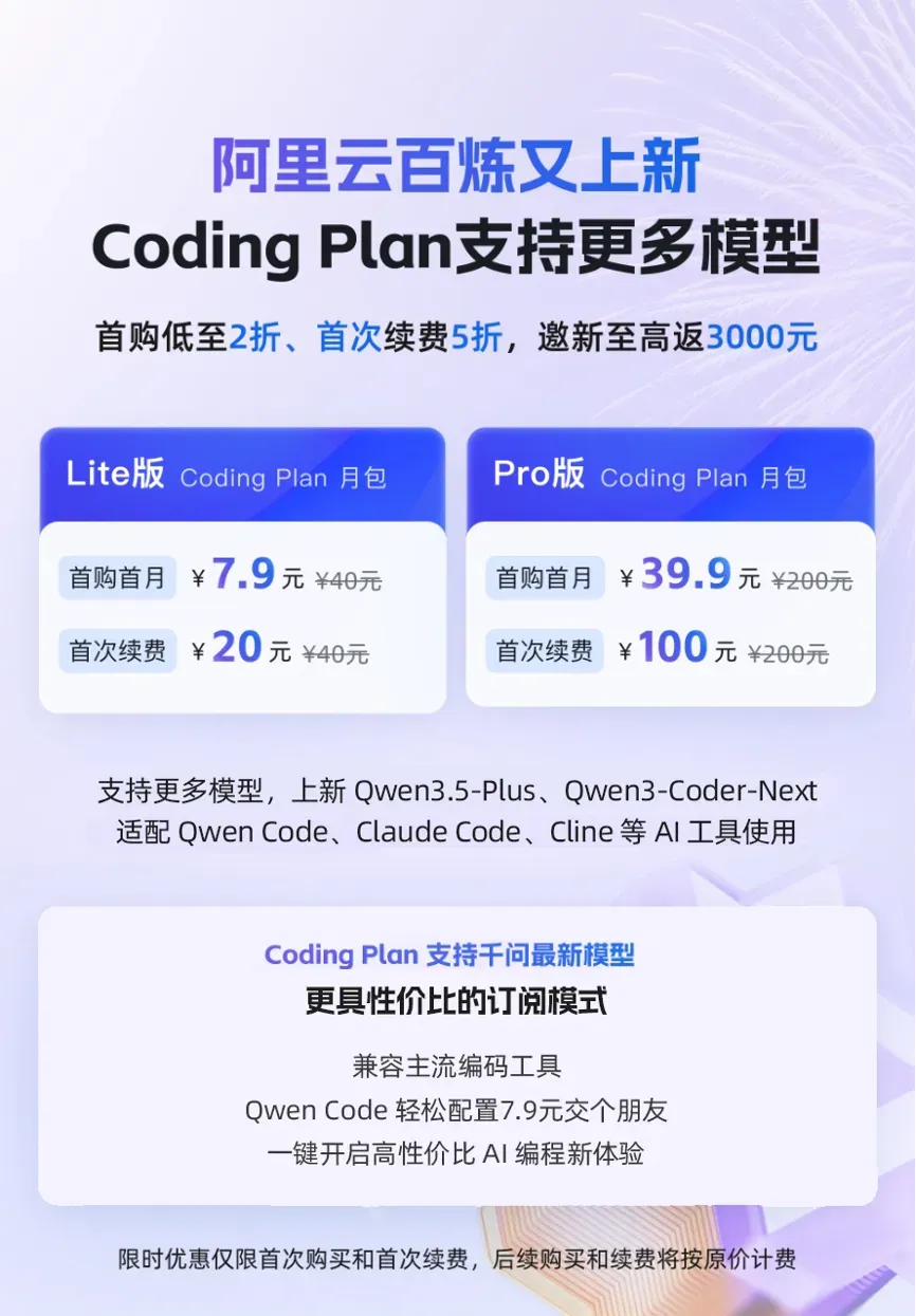 刚刚,阿里云Coding Plan订阅服务上新Qwen 3.5-Plus、GLM-4.7、Kimi-K2.5等编程模型,用户订阅后即可自由切换模型。
