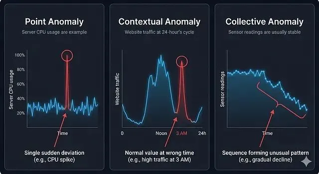 异常指的是与正常行为产生明显偏离的数据点或数据序列。举几个例子:凌晨 3 点网站流量突然飙升;传感器因设备故障出现读数骤降;已关门的商店内人流量异常激增。