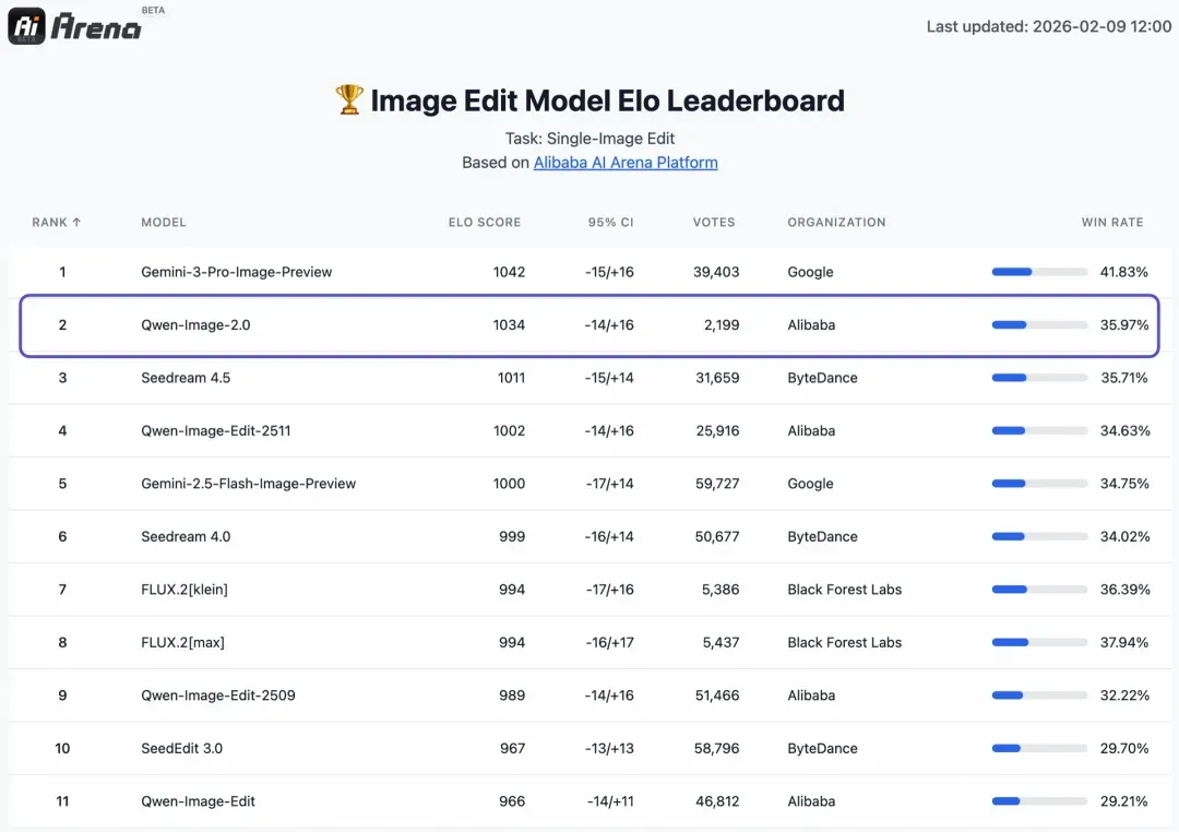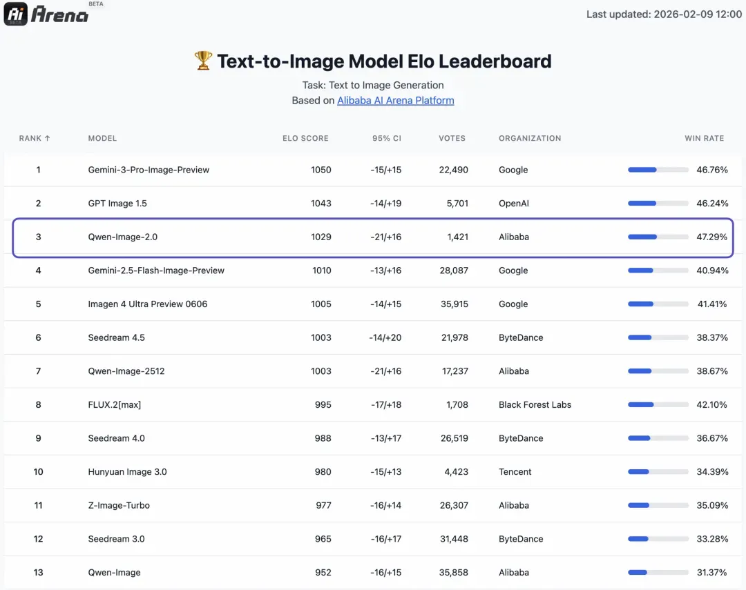 作为千问大模型的图像生成模型底座,Qwen-Image-2.0集生图和编辑于一体,在AI Arena文生图评测中斩获1029分,位列全球第三。