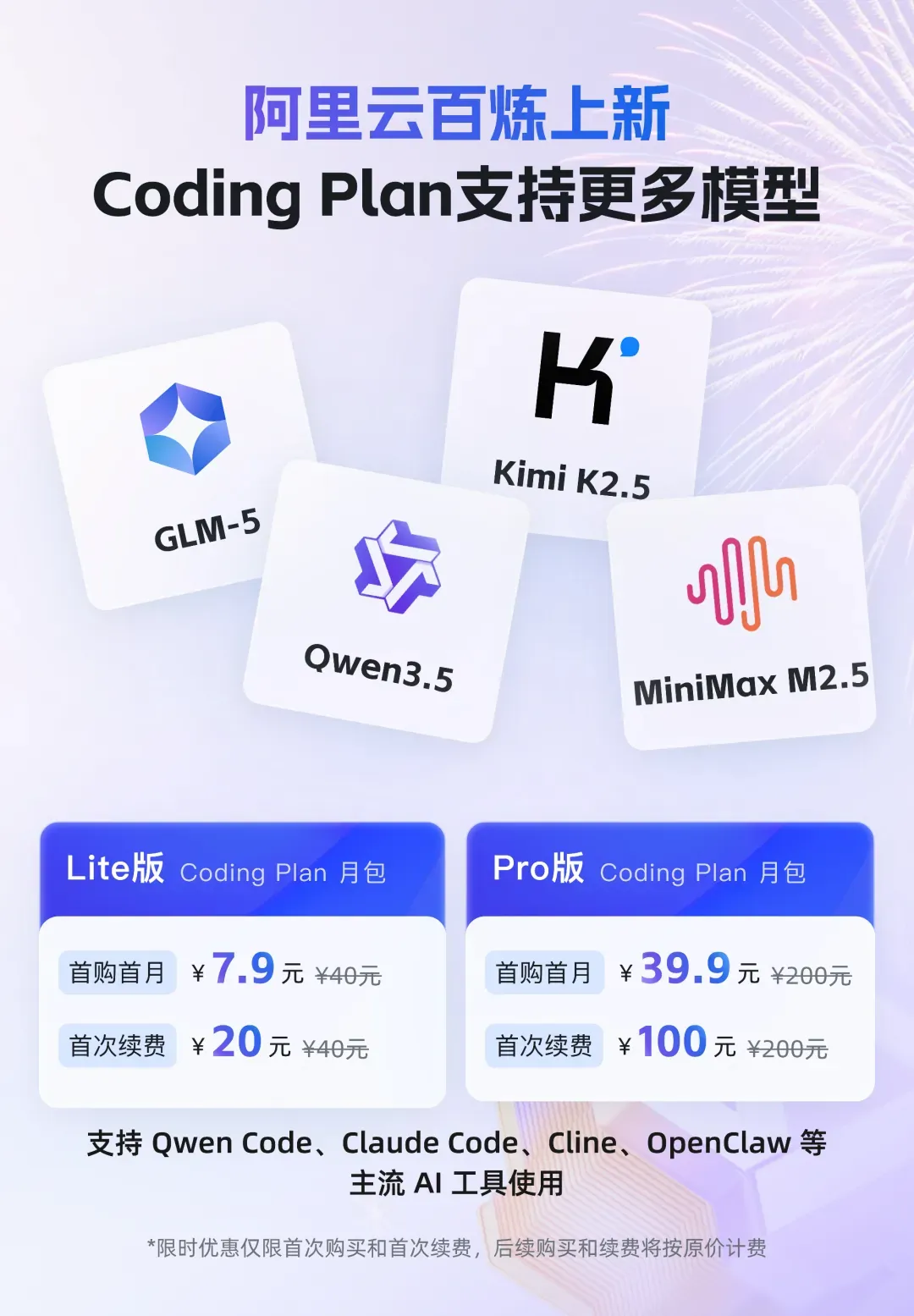 用户订阅套餐后,可在Qwen Code、Claude Code、Cline、OpenClaw等AI工具上自由切换使用这些模型,享受更稳定、Tokens额度更高的模型服务。