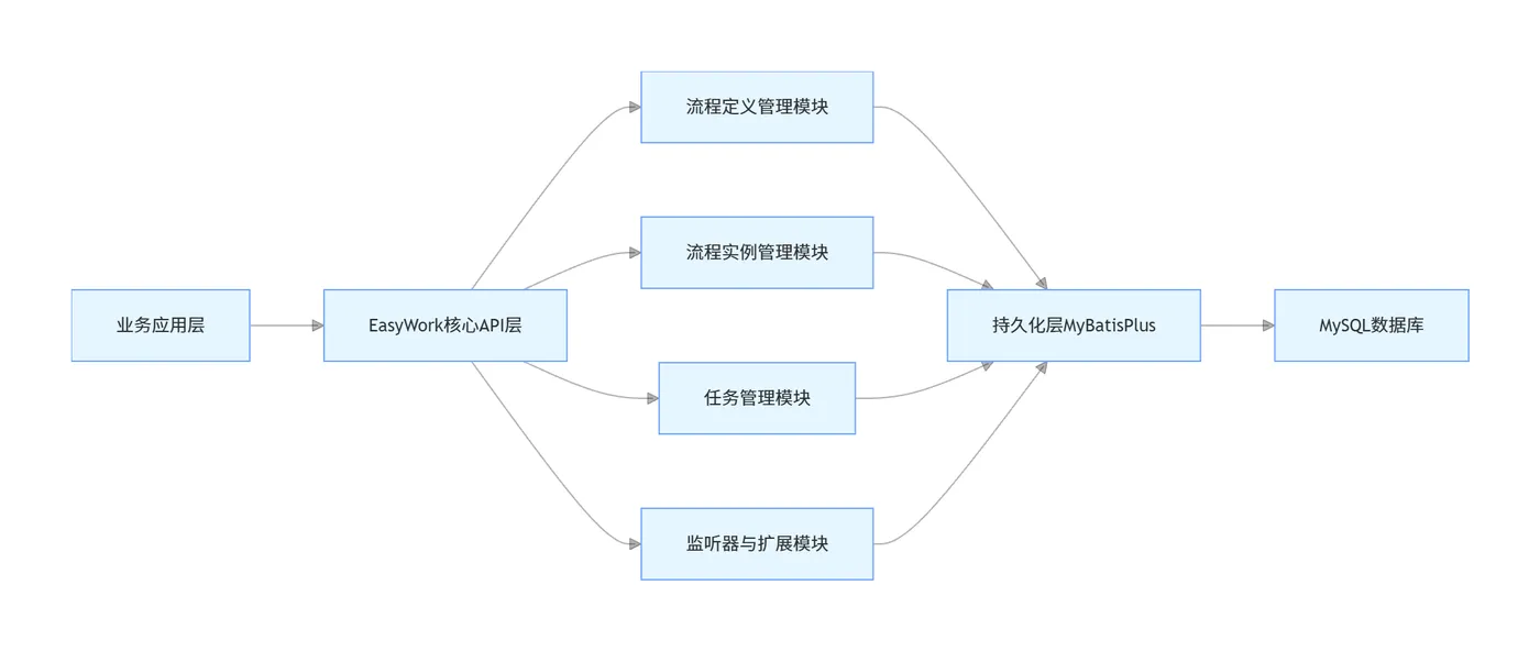 Easy Work采用分层架构设计,极致解耦,完美兼容Spring生态,整体架构如下: 各层核心职责: