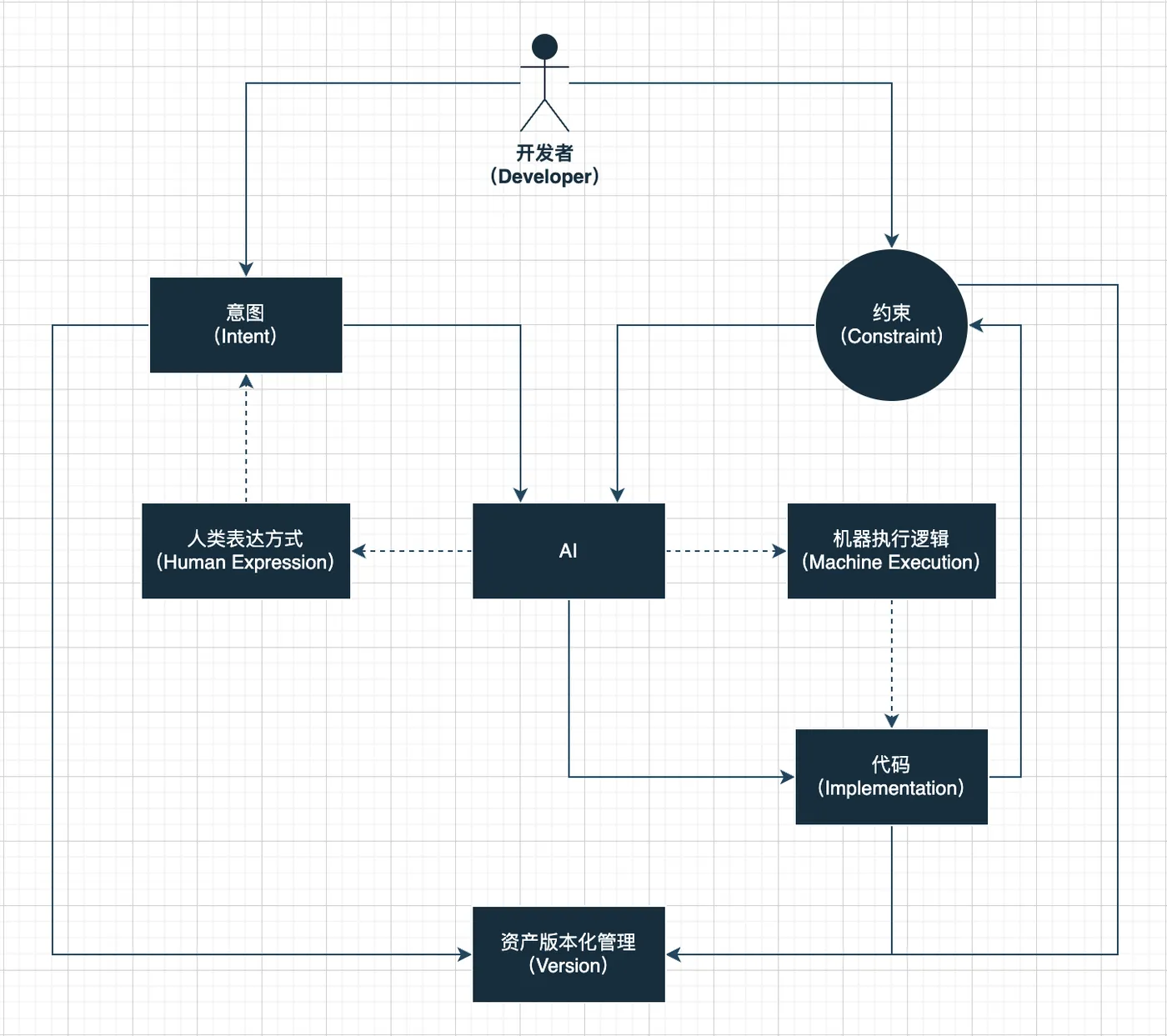 开发者在AI中按需注入约束(Constraint),约束可源于传统编程范式,也可源于专家经验,亦或其他来源,但需确保输出代码的形式合规性与意图一致性。