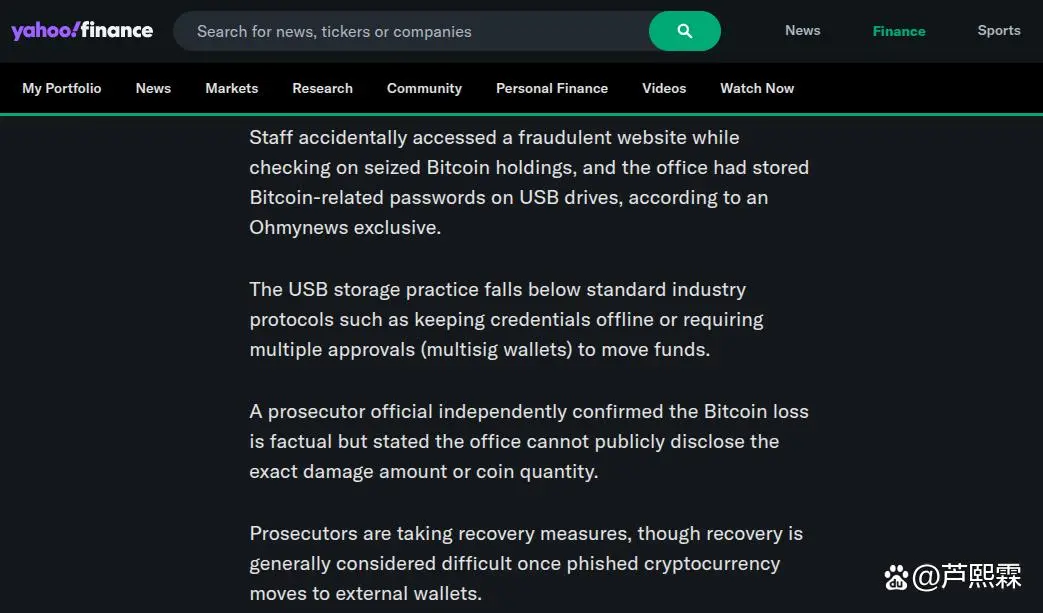 2026年1月披露的韩国光州检方比特币失窃案,为全球司法界敲响了警钟。据报道,光州地方检察厅工作人员在例行检查被扣押的比特币资产时,因误入钓鱼网站导致私钥泄露,致使约700亿韩元(折合4800万美元)的比特币被盗。调查显示,涉事检方将包含私钥信息的密码存储于普通的USB驱动器中,且未采用多重签名(Multisig)或硬件钱包隔离等行业标准安全措施。这一操作不仅违反了基本的网络安全卫生原则,更折射出司法体系在应对新型数字资产犯罪时,其内部保管机制与技术现实之间的巨大鸿沟。