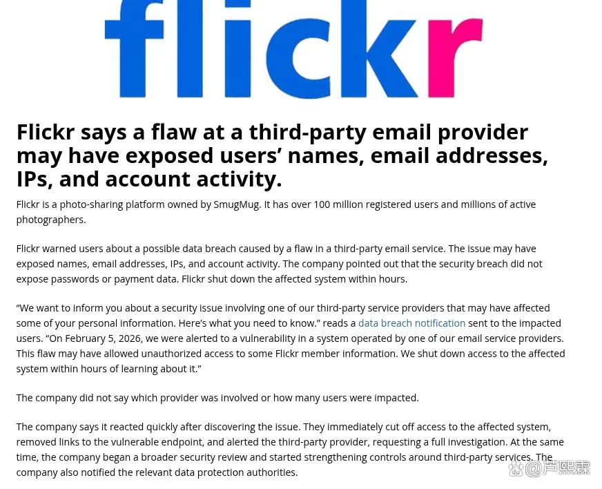 Flickr近期遭遇的数据暴露事件及其随后的安全警示,为研究这一现象提供了典型的实证案例。在该事件中,攻击者并未止步于获取初始数据,而是利用用户对事件的关注度,通过伪造邮件、短信及站内信,诱导用户点击恶意链接,进而窃取账户凭据、植入恶意应用或进行身份盗用。这种“借势作案”的模式表明,现代网络攻击已形成了一条完整的产业链:从初始入侵、数据窃取、情报售卖,到利用泄露信息定制钓鱼内容、实施精准诈骗。攻击者不再盲目撒网,而是基于泄露数据的上下文(Context-Aware)构建高度可信的叙事场景,显著提升了攻击的成功率。