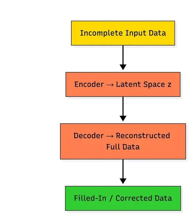训练好的 VAE 可以处理不完整输入——编码后在潜在空间中采样,再解码出完整的重建,从而填补缺失数据。典型场景有数据清洗、预处理和错误修正,比如补全图像中的缺失像素、物联网数据中丢失的传感器读数,或者残缺不全的交易记录。