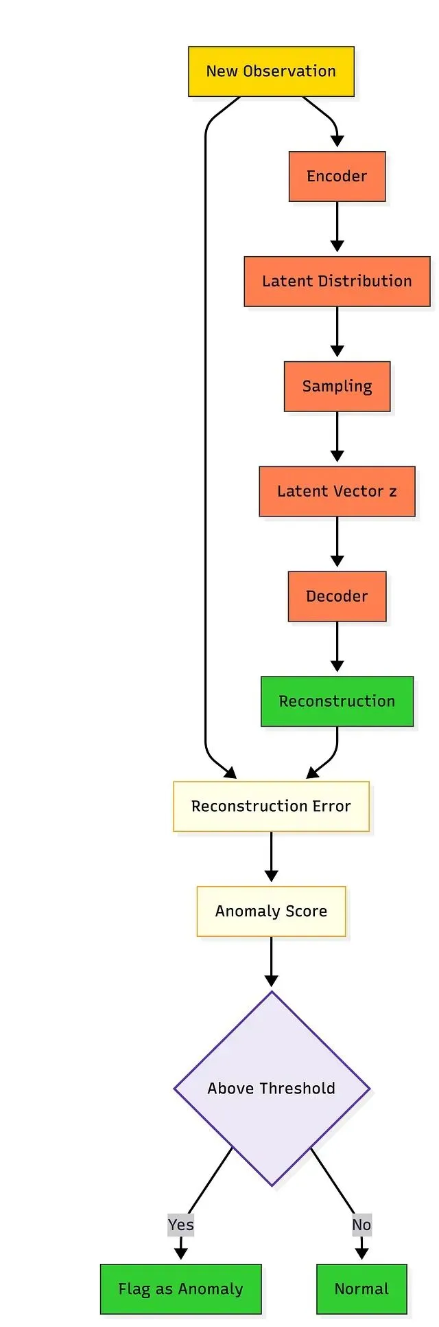训练结束后 VAE 已经建立了对"正常"数据的内部表征。新输入经过编码器→潜在空间→解码器后,将输出与原始输入做比较即可判断异常——重建误差越大,样本越可能偏离正常模式。以信用卡交易为例,消费模式异常的交易在重建时会产生明显偏差,对应较高的异常得分。类似场景还包括设备监控和医疗异常检测。关键推理信号是重建误差,或样本在已学分布下的似然度。
