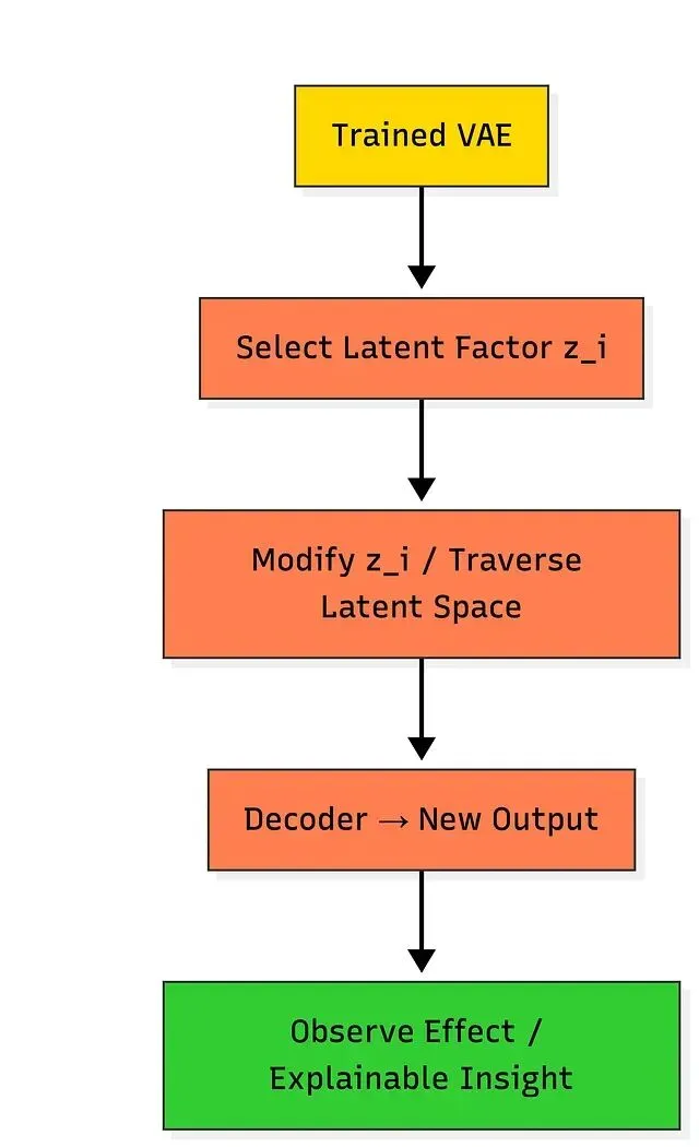 对潜在空间做分析和修改,可以观察输出如何随之变化。潜在遍历——固定其余维度、单独改变一个维度——能揭示各因子的语义含义;潜在空间本身也可用于聚类。一个具体的例子:在机械传感器数据中,某个潜在因子可能对应振动频率,调整它就能模拟机器提速后的状态。这类操作在可解释性分析、根因定位和场景规划中都有用处。
