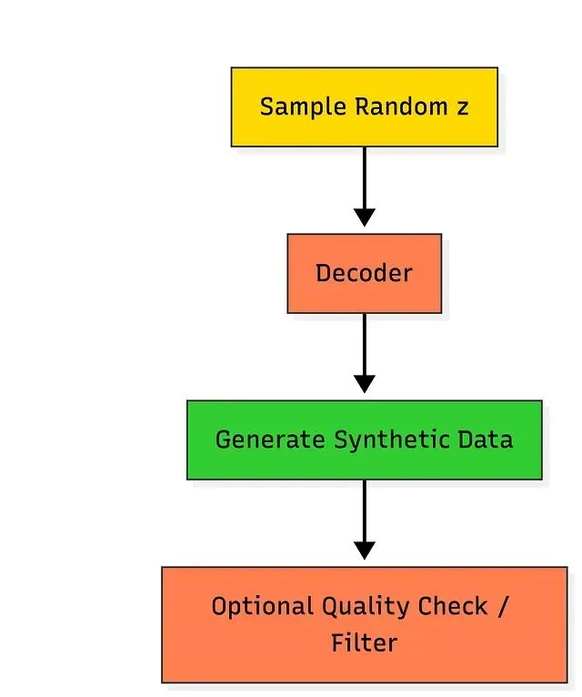 无需任何特定输入,直接在潜在空间中采样再经解码器输出,即可生成新的逼真样本。潜在空间在训练期间已被约束为近似标准正态分布,从中采样的点解码后会产生与训练数据风格相近的新数据。典型场景包括数据增强、系统仿真和压力测试。在医学领域,可以产出罕见病的逼真影像,或合成客户交易历史用于测试。