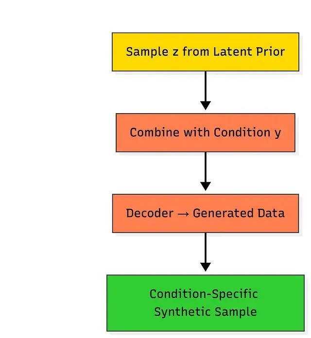在标准 VAE 基础上引入额外的条件信息,就得到了条件 VAE(CVAE)。例如基于标签生成图像,或基于客户群体生成合成交易、生成某类肿瘤的影像,或某商户类别的交易记录。应用方向包括定向数据增强、场景模拟、受控合成实验。