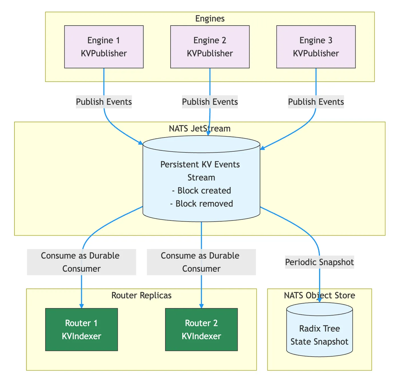 --durable-kv-events):Worker 将 KV 事件写入 NATS JetStream 持久化流,每个 Router 副本通过 durable consumer 独立消费事件流并更新自身索引。Router 重启后可以从 JetStream 重放未消费的事件,也支持 snapshot 快速恢复。适用于多副本 Router、需要一致性保证的生产环境。