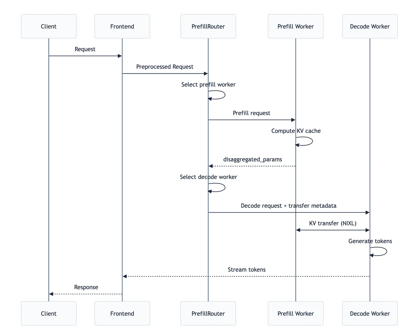 - Token 生成:Decode Worker 执行 Decode 阶段,生成并返回 token。