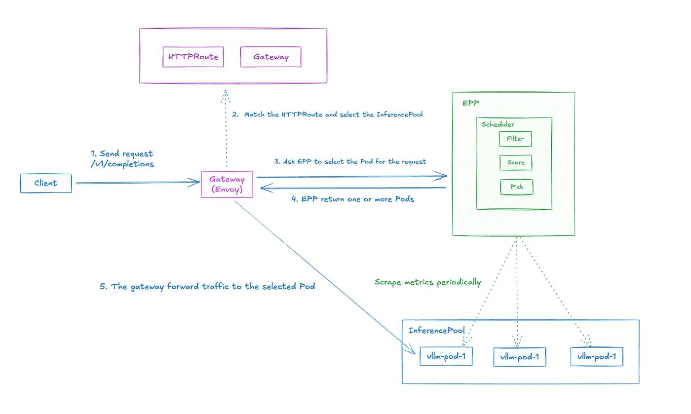 } # Kserver 自动创建 InferencePool + EPP Scheduler