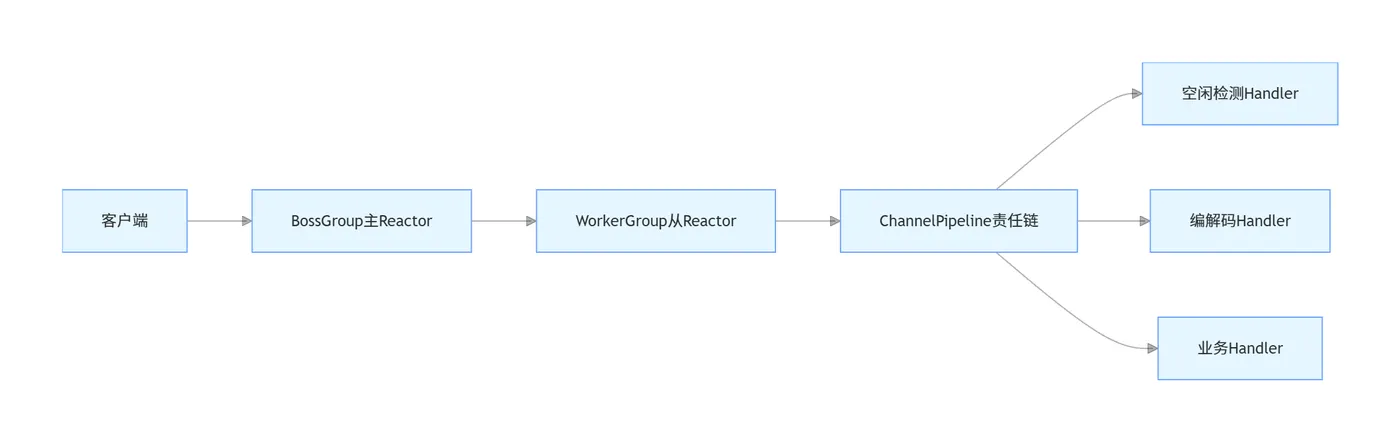 - ChannelInboundHandler:入站事件处理器,处理网络底层传入的事件,如连接建立、数据读取、空闲事件、异常通知等