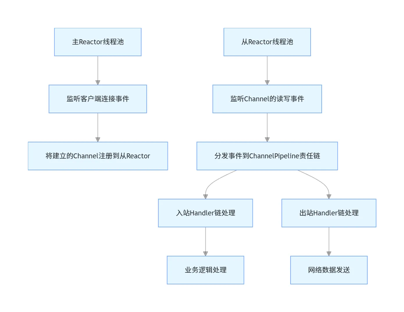 - 从Reactor(WorkerGroup):负责管理已注册的Channel,监听所有读写事件,事件就绪后,将事件分发到Pipeline责任链中,由对应的Handler完成业务处理