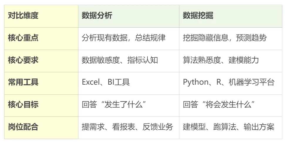 现在很多公司会把这两类人放在一个部门里,数据分析师负责提需求、看报表,数据挖掘工程师负责建模型、跑算法。两者配合好了,效果是1+1大于2的。