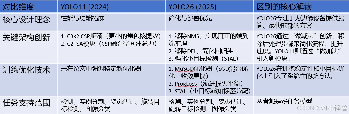 YOLO26引入了多项关键架构创新,使其区别于前几代YOLO模型。这些增强不仅提高了训练稳定性和推理效率,还从根本上重塑了实时边缘设备的部署流程。本节将详细描述YOLO26的四项主要贡献:(i)移除分布焦点损失(DFL),(ii)引入端到端无NMS推理,(iii)新颖的损失函数策略,包括渐进损失平衡(ProgLoss)和小目标感知标签分配(STAL),以及(iv)开发用于稳定高效收敛的MuSGD优化器。我们将详细讨论每一项架构增强,并通过对比分析突显其相对于YOLOv8、YOLOv11、YOLOv12和YOLOv13等早期YOLO版本的优势。