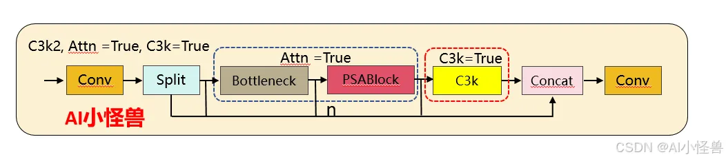 重复模块m (n次迭代): ┌─────────────────────────────────────────────────────────┐ │ │ │ 如果 attn=True: │ │ Sequential( │ │ Bottleneck(self.c, self.c), │ ←─ 先特征提取 │ PSABlock(self.c, attn_ratio=0.5, num_heads=...) │ ←─ 后注意力增强 │ ) │ │ │ │ 否则如果 c3k=True: │ │ C3k(self.c, self.c, 2) │ ←─ 同YOLOv11 │ │ │ 否则: │ │ Bottleneck(self.c, self.c) │ ←─ 同YOLOv11 │ │ └─────────────────────────────────────────────────────────┘