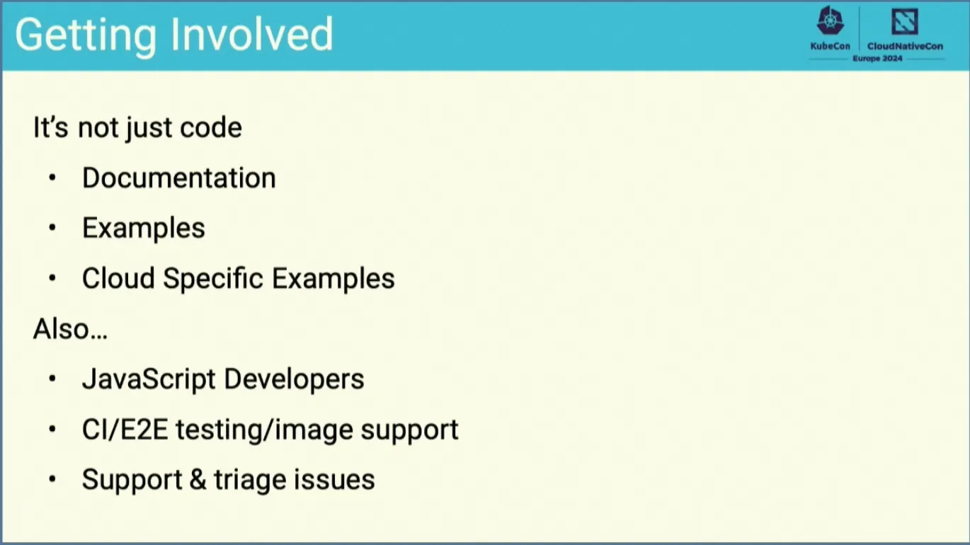 与此形成强烈对照的是,Ingress NGINX社区只有2个半的维护者,并且他们都不是全职维护这这个项目。2024年春天的kubecon欧洲峰会上,他们还在雄心勃勃地计划令人振奋的功能特性:更新的NGINX版本、支持NGINX Javascript、启动新的演进。但是缺乏足够维护者的窘境,让他们把所有精力都放在了修复安全问题上,以及引入security level以期全方面加强安全性和稳定性,这导致了前面宣布的支持NGINX Javascript、新的演进到今天都没有完成。这两年的kubecon峰会,从北美到欧洲再到亚洲,Ingress NGINX维护者不变的胶片是呼吁更多的开发者加入: