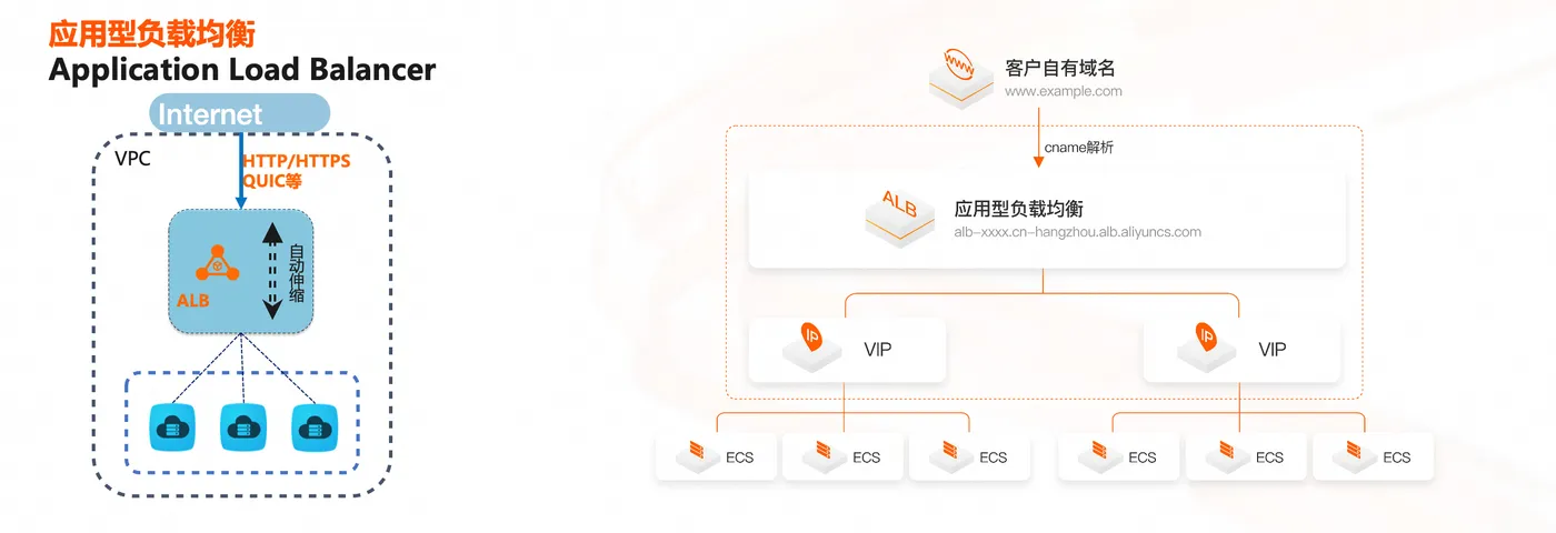 - 应用型负载均衡ALB具有即开即用,超大性能,稳定可靠,弹性伸缩,按需付费等特点,SLA高达99.995%,更加适合7层应用交付场景。